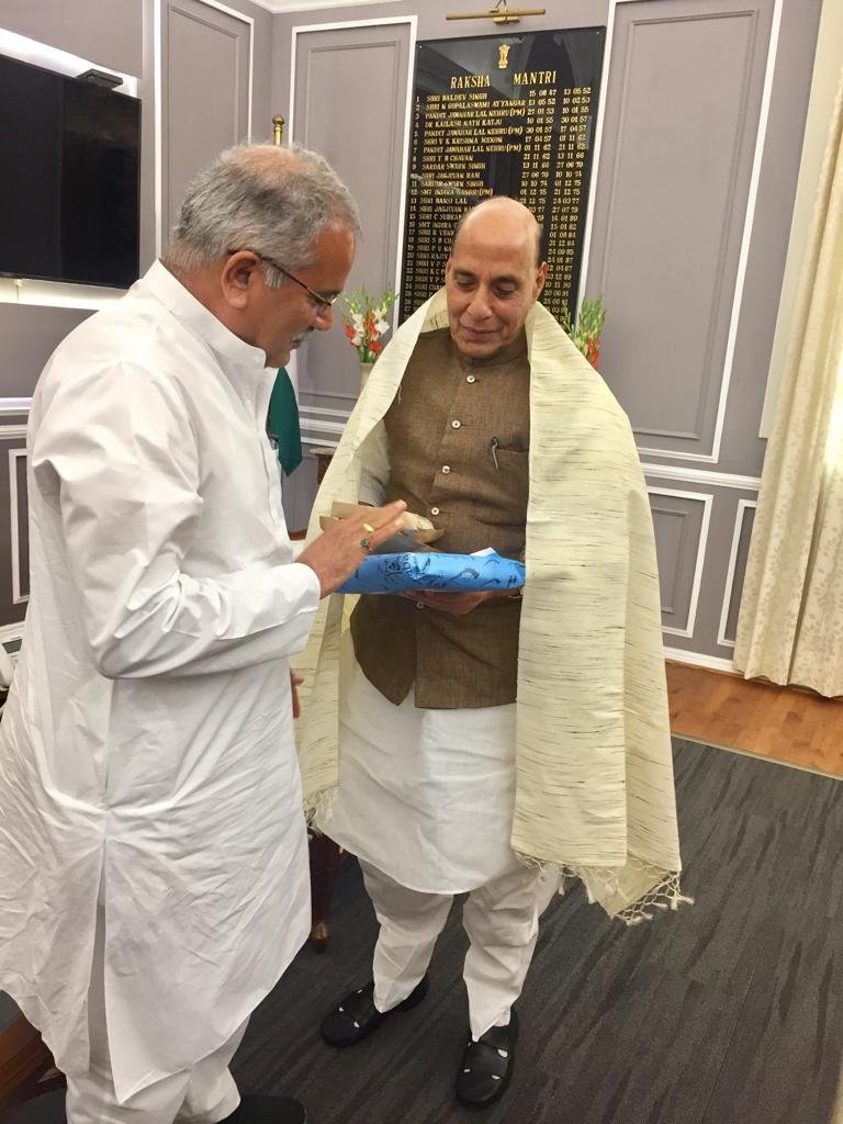 गौरतलब है कि नया रायपुर में इंडियन एयरफोर्स के एयरबेस की स्थापना प्रस्तावित है। इसके लिए भूमि आवंटन और भू अर्जन को लेकर प्रक्रिया काफी समय से लंबित है। मुलाकात के दौरान बघेल ने एयरबेस कैंप की स्थापना की प्रक्रिया जल्द पूरा कराने का आग्रह किया। इस दौरान मुख्यमंत्री ने रक्षा मंत्री राजनाथ सिंह को छत्तीसगढ़ के ऑर्गेनिक चावल और राज्य के बुनकरों द्वारा बनाया गया नेचुरल डाई से तैयार कोसे का कुर्ता भी भेंट किया।